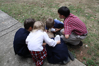 Tobias (left), Anna C., and Benaiah, with some other young friends at church, investigating a salamander in a hole.